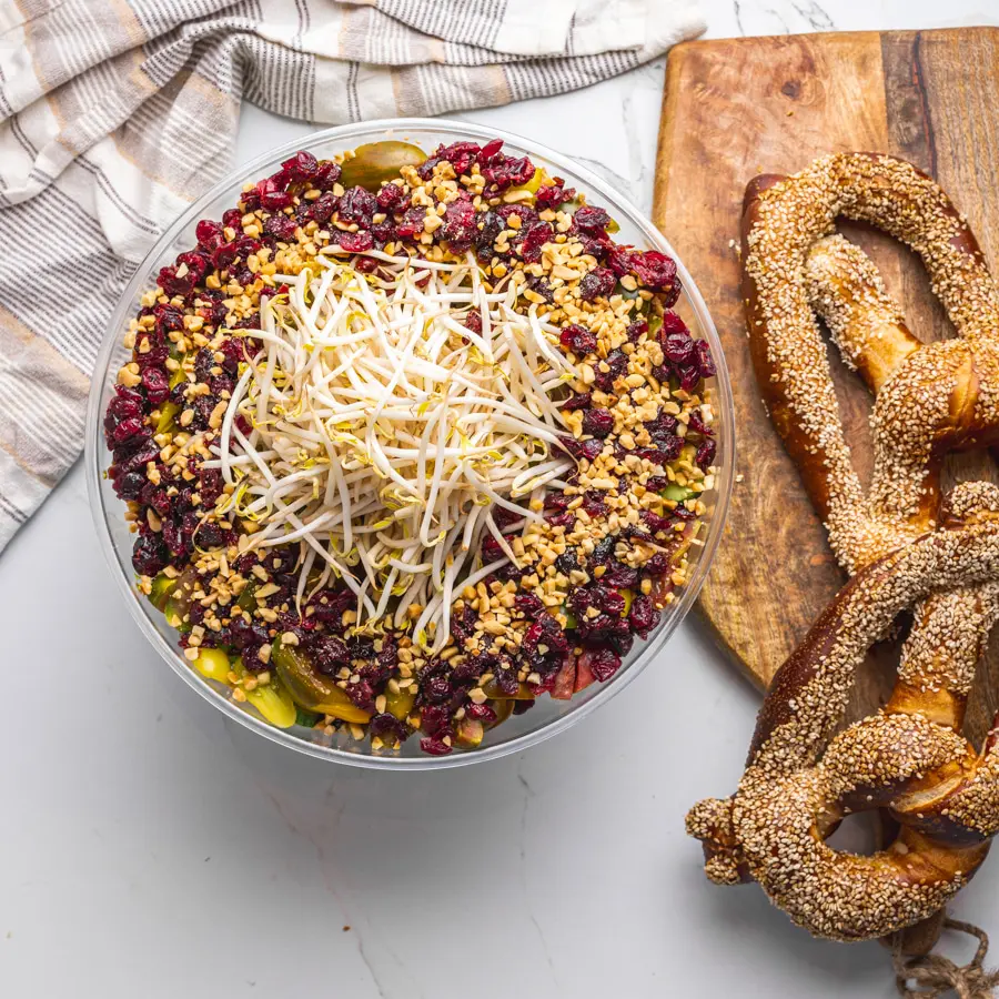 סלט ירקות גינה, עשבתי תיבול קצוצים, חמוציות בוטנים ונבטים ברוטב שמן זית, לימון ודבש.