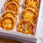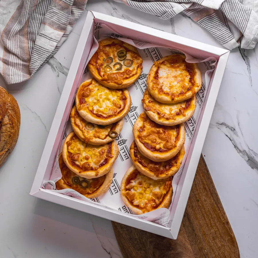 מיני פיצה עם ממרח רוטב עגבניות, מגיע עם תוספות לבחירה אישית: זיתים ירוקים, זית קלמטה וגבינת מוצרלה