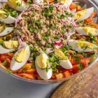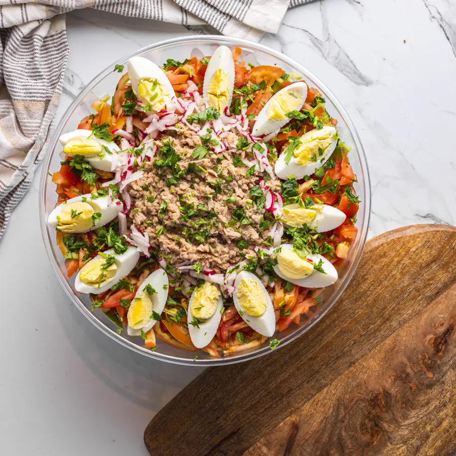 סלט מירקות גינה, טונה וביצה קשה ברוטב אלף האיים ושום.